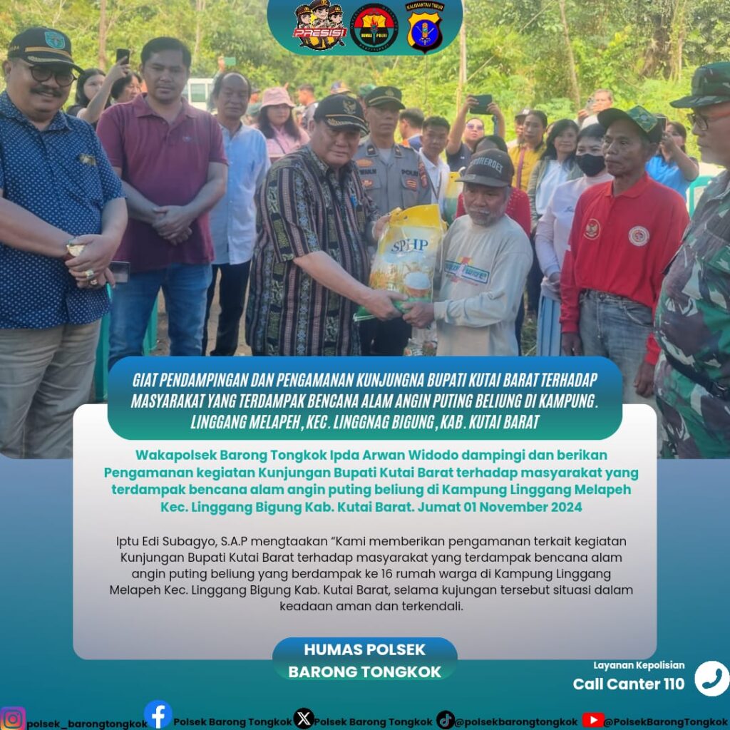 Linggang Melapeh, Kec. Linggnag Bigung, Kab. Kutai Barat.Kapolsek Barong Tongkok di wakili Wakapolsek Barong Tongkok Ipda Arwan Widodo dampingi dan berikan Pengamanan kegiatan Kunjungan Bupati Kutai Barat terhadap masyarakat yang terdampak bencana alam angin puting beliung di Kampung Linggang Melapeh Kec. Linggang Bigung Kab. Kutai Barat. Jumat 01 November 2024Hadir pada kunjungan tersebut Bupati Kutai Barat (Fx Yapan, SH), Sekda Kutai Barat (Ayonius S.Pd M.M), Kadis Pendidikan dan Kebudayaan (R.L Bandarsyah S.E M.Si),/Sekretaris BPBD (Jamri S.Hut), Kadis Ketahanan Pangan (Dr. Rion S.ST. S.IP.M.Si), Danramil 13/Barong Tongkok (Kapten Inf Hariyadi) dan Wakapolsek Barong Tongkok Ipda Arwan Widodo, Sekcam Linggang Bigung (Nurmala Suciati SKM. M.Kes) serta Petinggi Kampung. Linggang Melapeh (Hermaniel).Iptu Edi Subagyo, S.A.P mengtaakan “Kami memberikan pengamanan terkait kegiatan Kunjungan Bupati Kutai Barat terhadap masyarakat yang terdampak bencana alam angin puting beliung yang berdampak ke 16 rumah warga di Kampung Linggang Melapeh Kec. Linggang Bigung Kab. Kutai Barat, selama kujungan tersebut situasi dalam keadaan aman dan terkendali.
