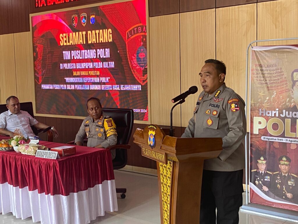 Penetian Puslitbang Polri di Polresta Balikpapan mengangkat tema “Meningkatkan Kepercayaan Publik” Penguatan Peran Polri dalam Pengejaran Buronan Beserta Hasil Kejahatan di wilayah Polda Kaltim”.